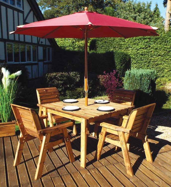 PLEASE NOTE: This price does not include parasol! The Four Seater Square Table Set from Charles Taylor is a classic outdoor dining table and chairs. This superb outdoor garden furniture set provides 4 x Traditional Chairs (HB18) and 1 x Medium Square Table (HB60) to create a medium-sized outdoor dining area perfect for sunny days. The table has a centre hole designed for use with parasols that can provide some needed shade on particularly hot days.