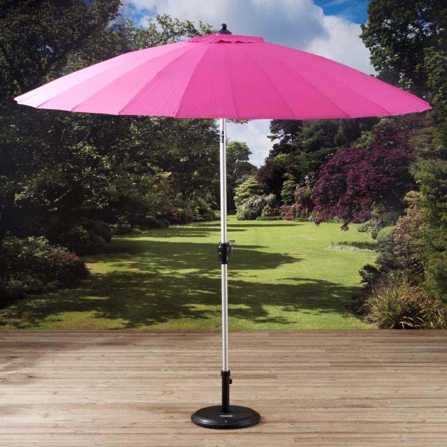 - 2.7m Shanghai Parasol in Cerise Pink fabric. Features crank and tilt mechanism.